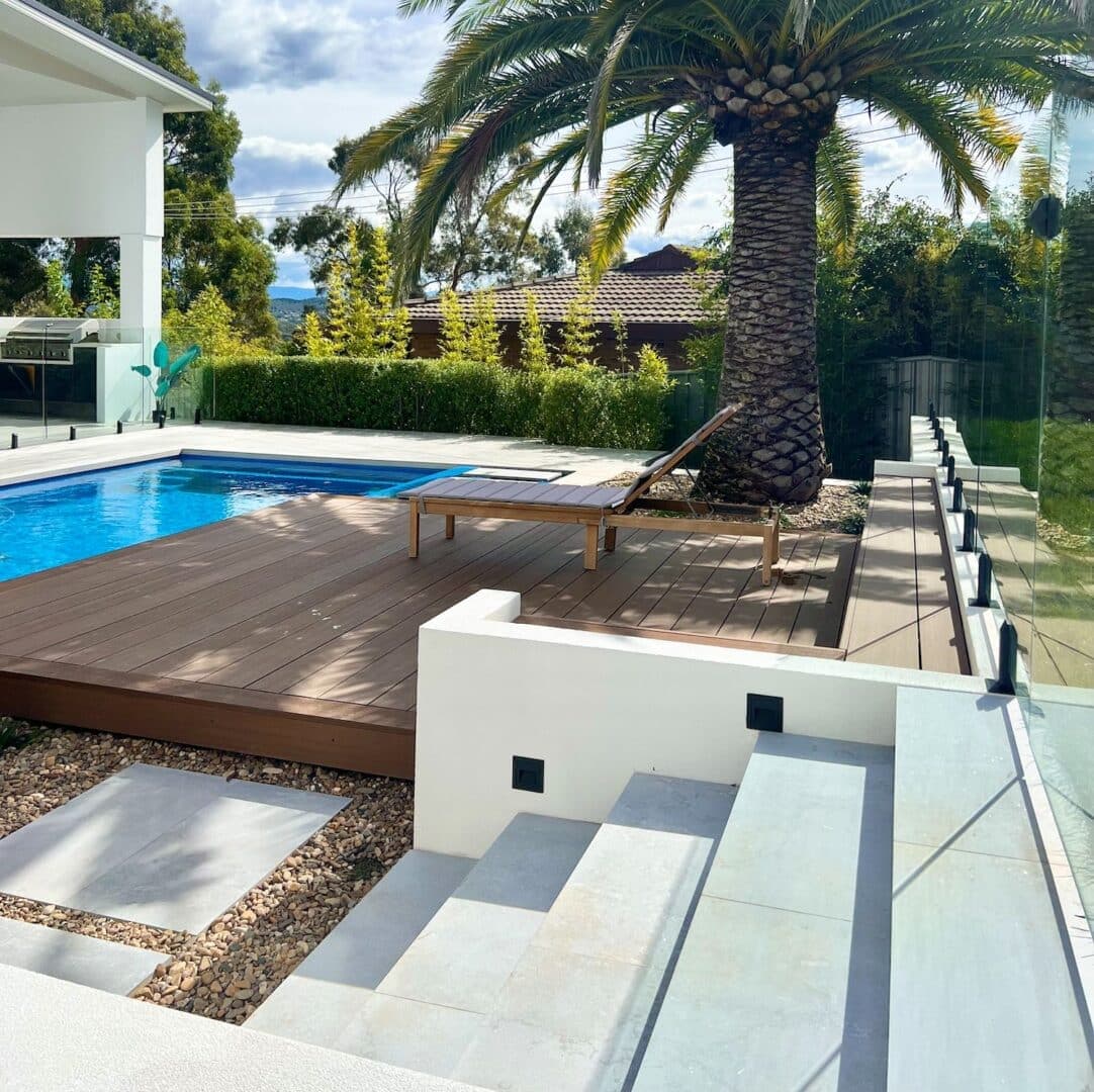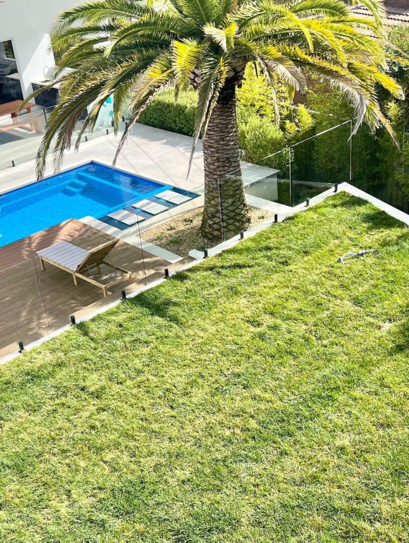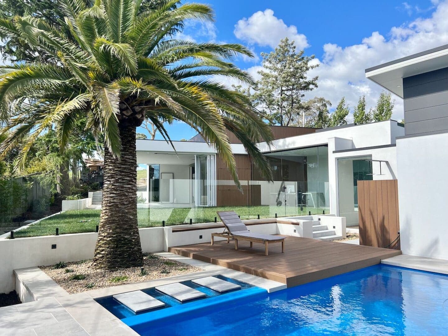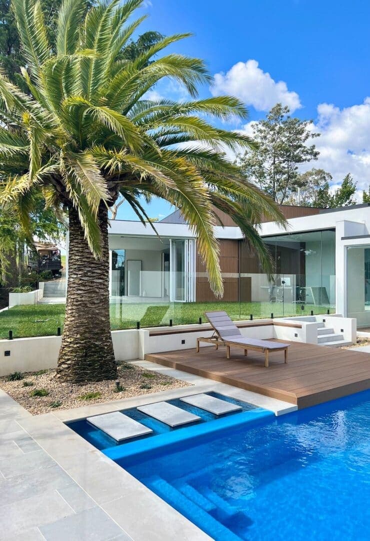 Leading down from the expansive middle-tiered turf level a is a deck area surrounded by inbuilt seating overlooking the pool. Located within the pool area feature stepping stones connecting the deck to the alfresco area. This space provides additional zones for lounging, cooking, and dining. Complimented by surrounding planted garden beds with a large feature palm, the space is truly an entertaining paradise.