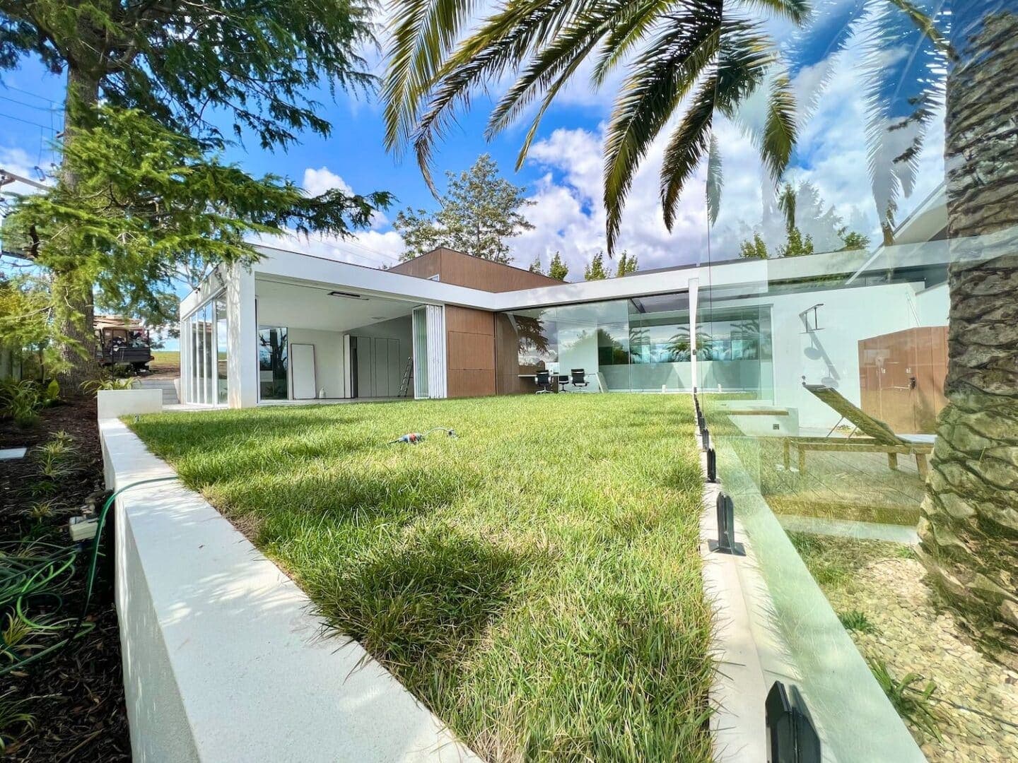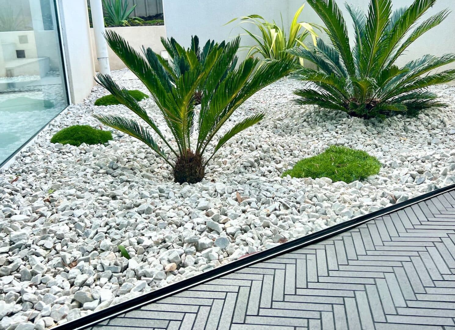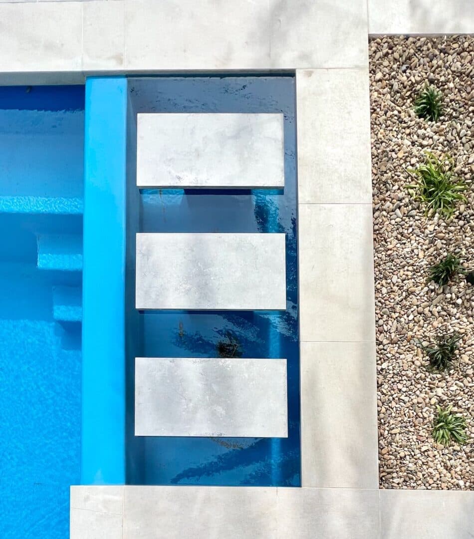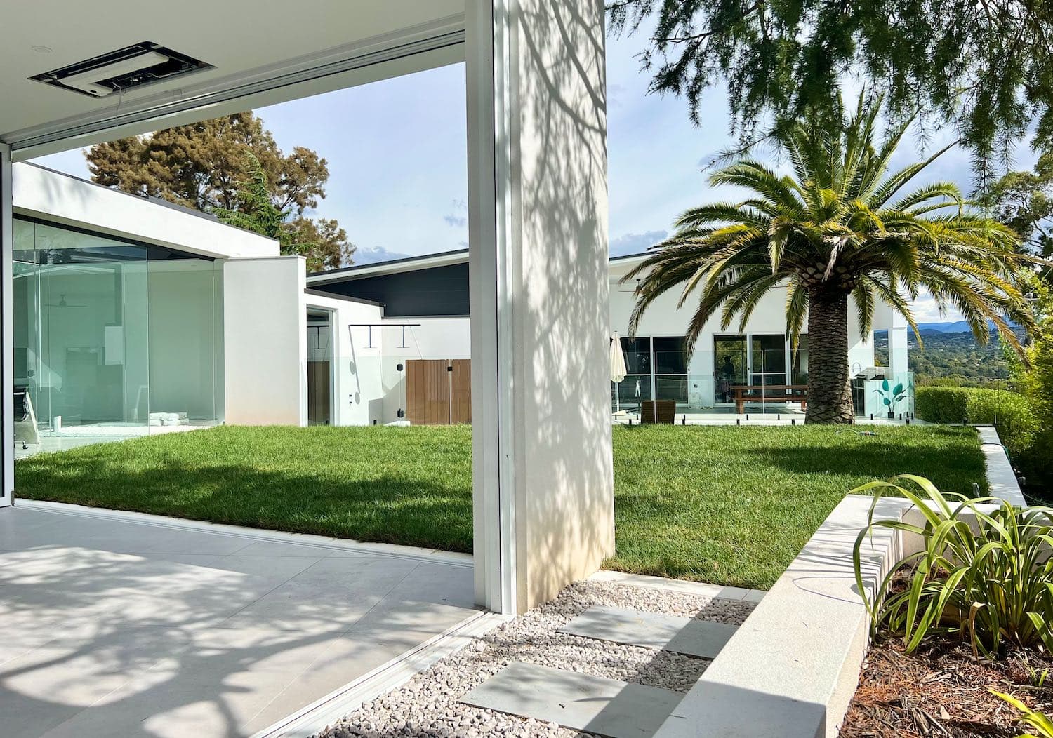 Leading down from the expansive middle-tiered turf level a is a deck area surrounded by inbuilt seating overlooking the pool. Located within the pool area feature stepping stones connecting the deck to the alfresco area. This space provides additional zones for lounging, cooking, and dining. Complimented by surrounding planted garden beds with a large feature palm, the space is truly an entertaining paradise.
