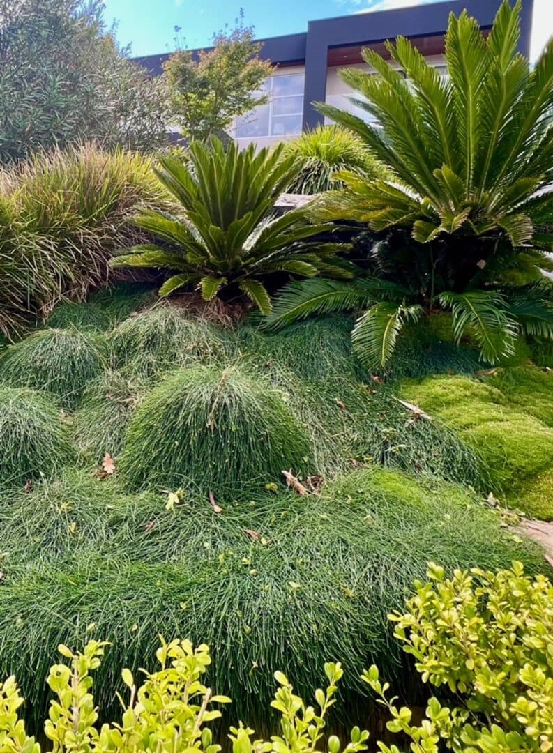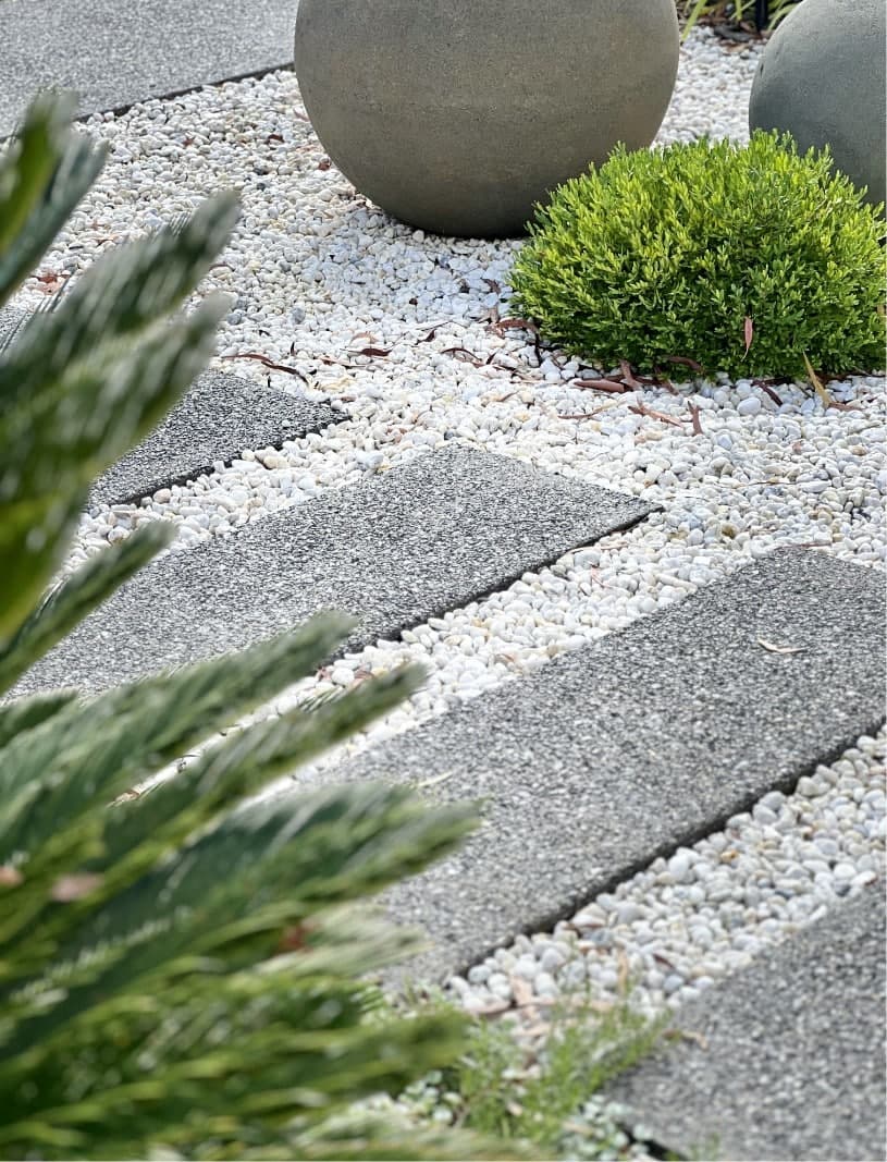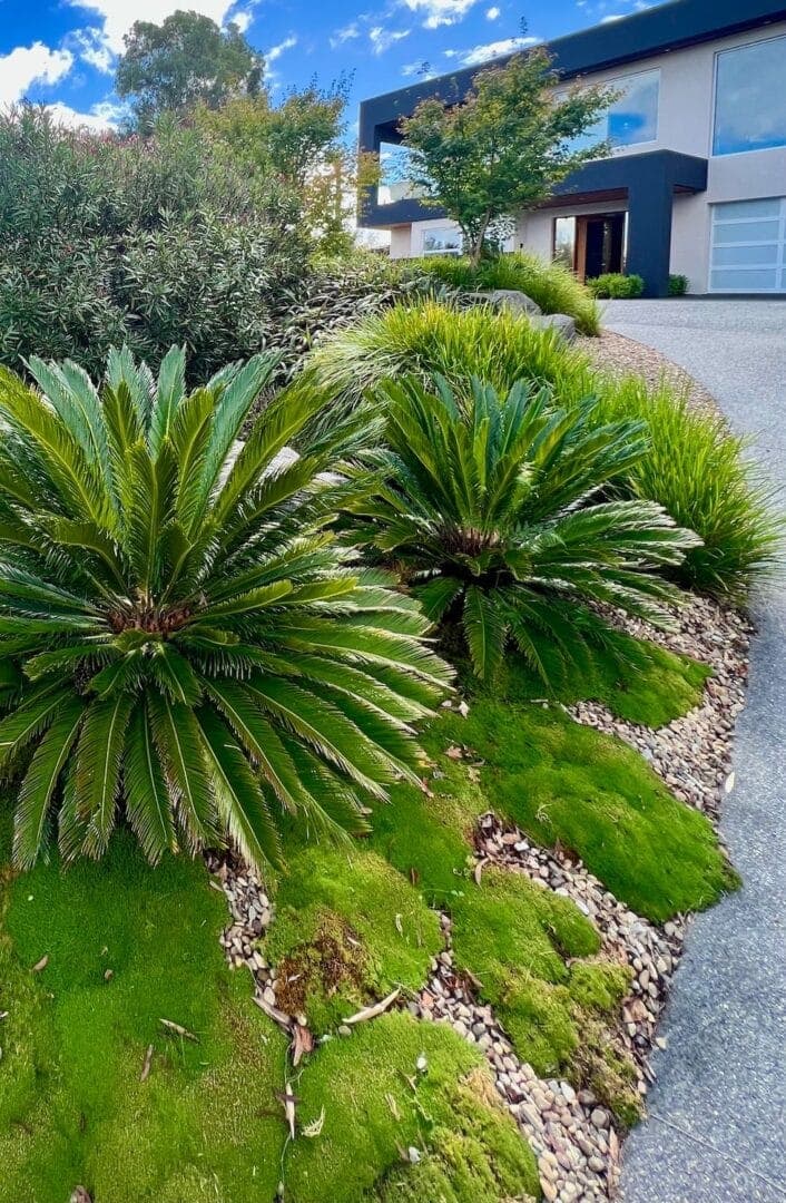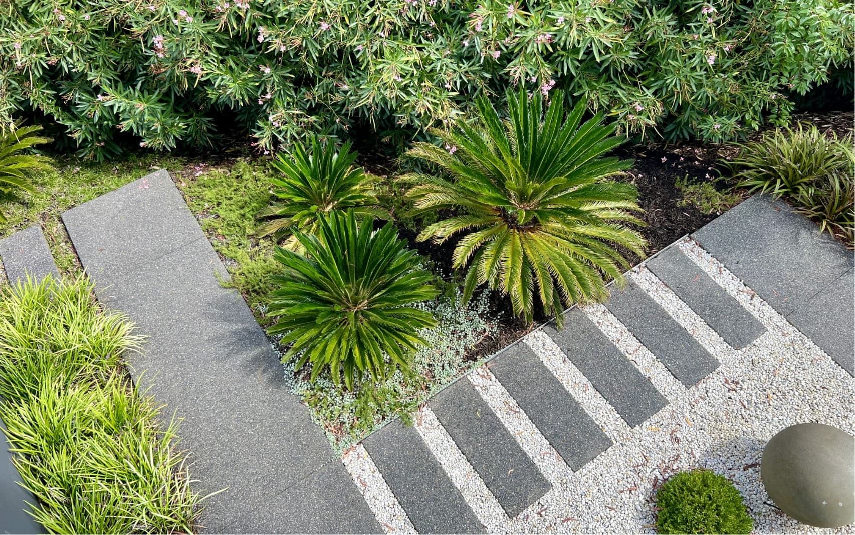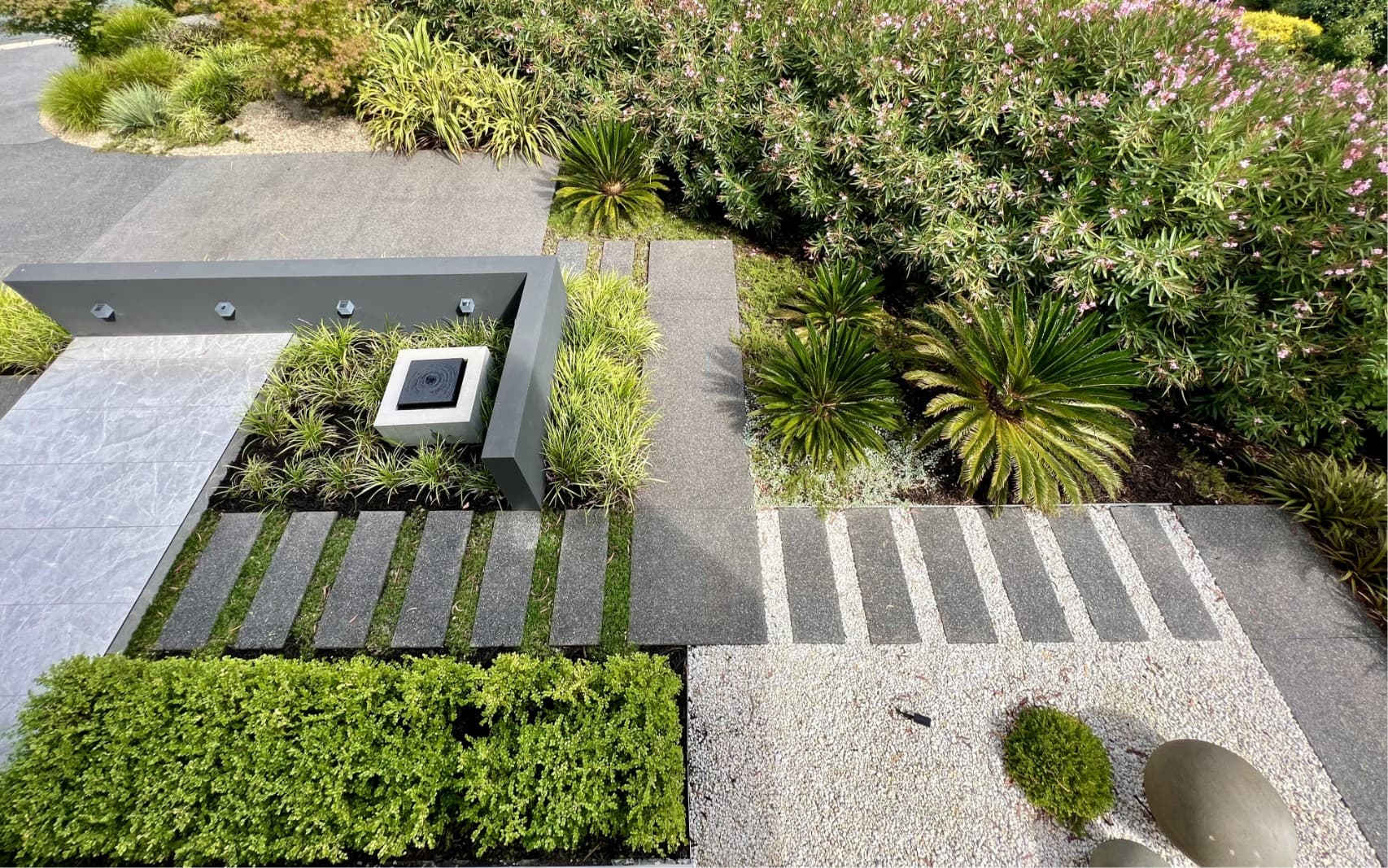 Geometric paths flow from the oversized driveway delineating the garden boundaries whilst also connecting the varied spaces the garden has on offer. A custom letterbox, adorned with large cycads, graces one of the planters, adding a distinctive touch.